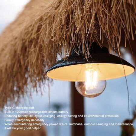 CHARGEMENT USB La lampe de camping LED dispose d’un port de chargement de type C, d’une batterie au lithium rechargeable intégrée de 1 200 mAh, d’une longue durée de vie de la batterie, d’une charge cyclique, d’une économie d’énergie et d’une protection de l’environnement.