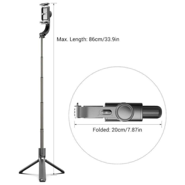 Conçu en alliage d’aluminium et en ABS, le L08 est à la fois léger (environ 200 g) et robuste. Lorsqu’il est plié, il mesure 19 cm, et peut s’étendre jusqu’à 86 cm, offrant ainsi une large gamme de longueurs pour s’adapter à diverses situations de prise de vue. Il est compatible avec la plupart des smartphones Android (version 4.3 et ultérieure) et iOS (version 5.1 et ultérieure) ayant une largeur comprise entre 76 mm et 85 mm.