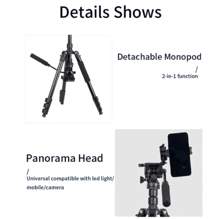 Ce modèle se distingue par sa conception 2-en-1, permettant une utilisation en tant que trépied classique ou monopode, offrant ainsi une flexibilité accrue selon les situations de tournage. Sa rotule fluide panoramique assure des mouvements doux et précis, essentiels pour réaliser des vidéos fluides et des panoramas impeccables.