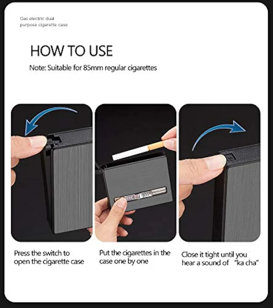 Gardez vos cigarettes dans un étui à cigarettes lorsque vous sortez il suffit de l’emporter avec vous, c’est très pratique. Cet étui à cigarettes, équipé d’un fil d’allumage et d’un puissant briquet à flamme bleue, est étanche et confortable à transporter.